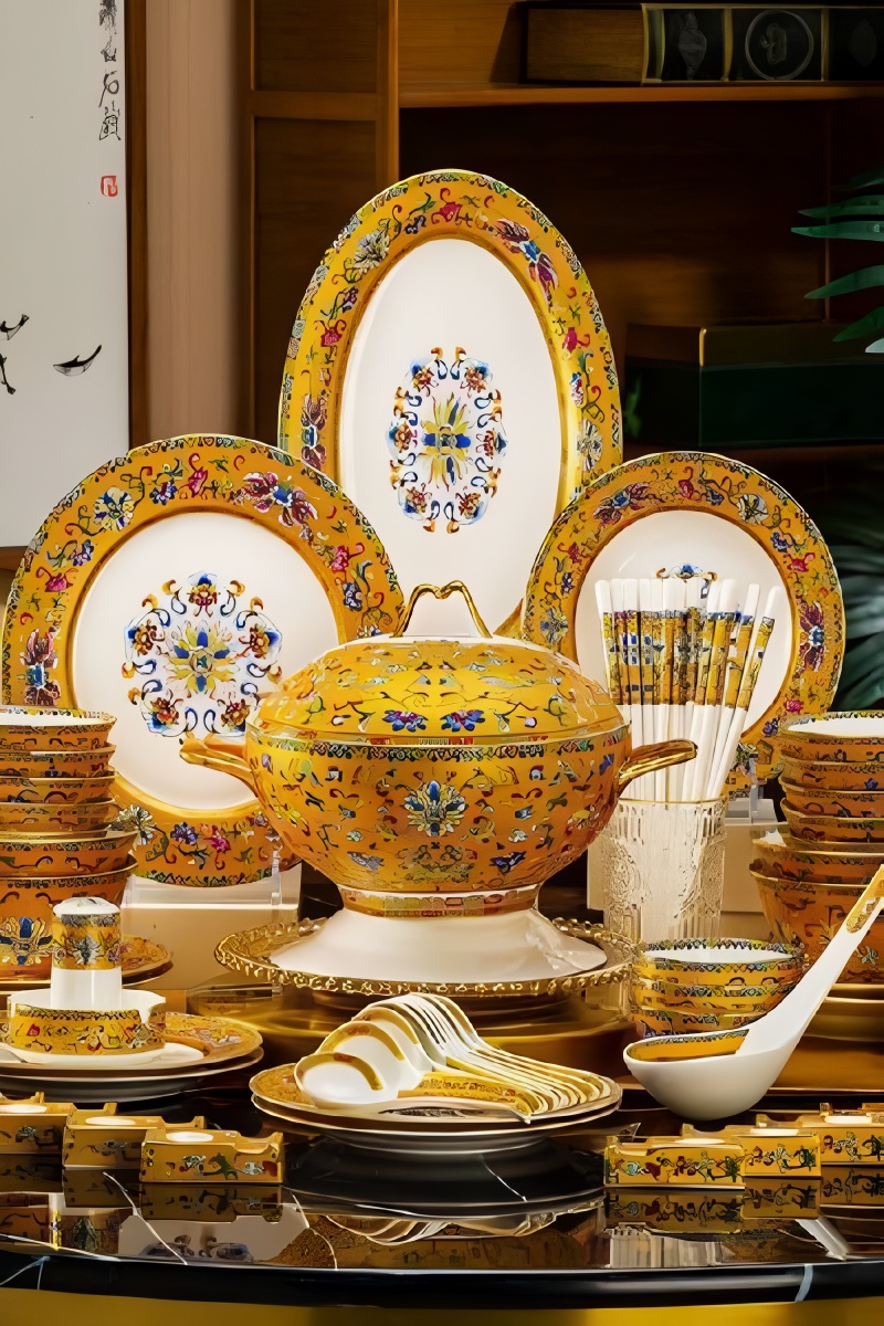 Exuding opulence and regal charm, this royal gold enamel suit set is crafted for those with a taste for aristocratic elegance. Each piece showcases exquisite enamel detailing and refined craftsmanship. A top-tier luxury ensemble perfect for elite gatherings and distinguished displays.